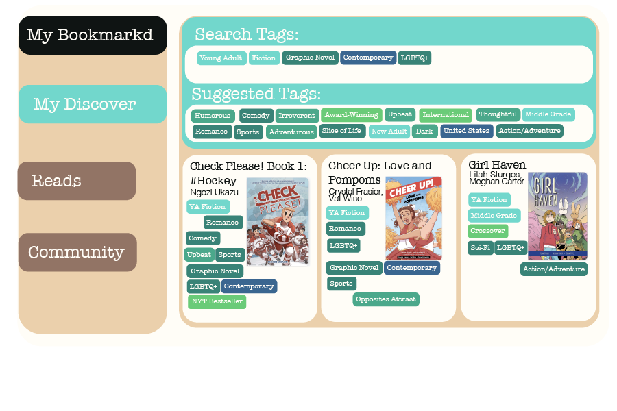 From there, I kept iterating and developing the prototype for usability of concept, until I felt comfortable to apply Bookmarkd’s aesthetic to the prototype. Since the Discovery and Library tabs of the “app” would be the most prominent and used features, I prioritized modeling how those functions would work, to best sell the vision of the final product.