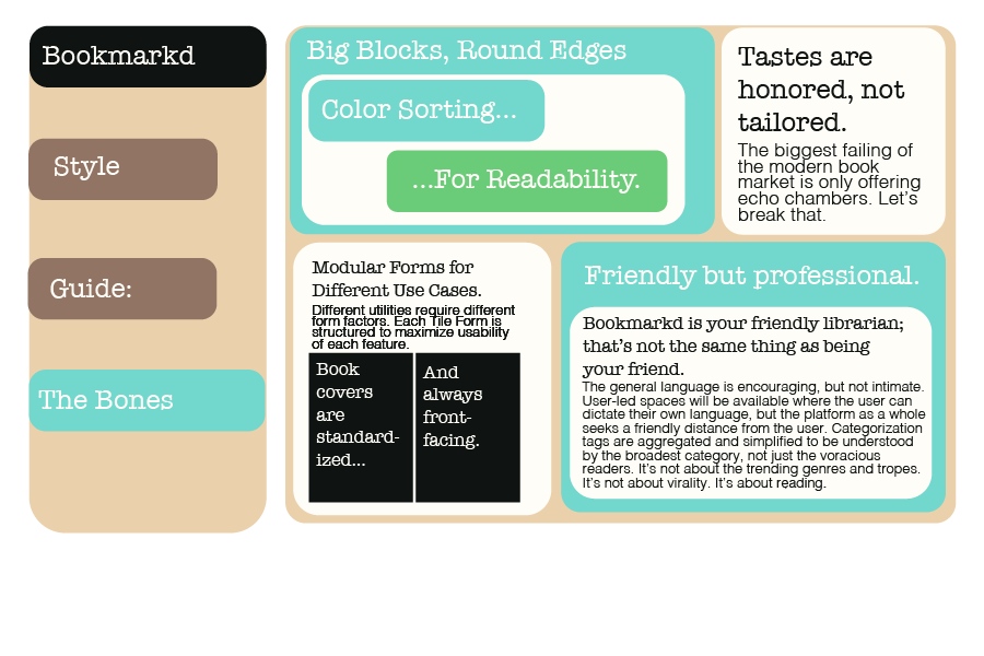 Early branding concepts for Bookmarkd, including fonts and brand colors, vision and mission statements, and early interface ideas.