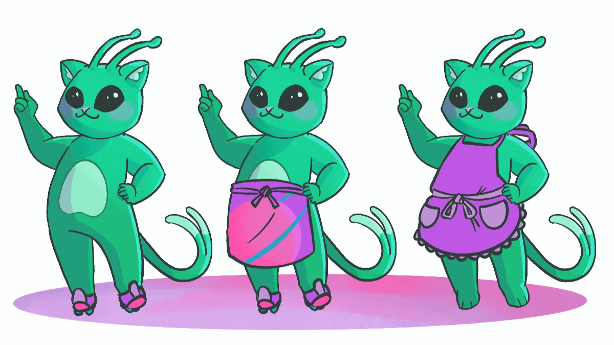 My first draft of Glorp’s design is what became his final iteration, and, true to his source material, we chose to keep his design as a cute little alien kitten. Drawing inspiration from Spongebob Squarepants and Big Boy, we decided to display him holding up a burger as the key action pose, and giving him roller skates to allow for more interesting poses.