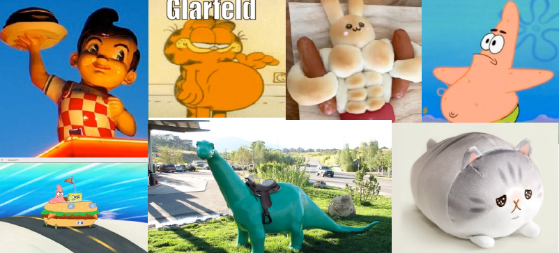 Fig. 3: moodboard for mascot creation. Clockwise from top left: Big Boy, Garfield, a bunny-shaped hotdog bread loaf, Patrick Star, Crying Cat plush, the Sinclair Dinosaur, and Spongebob and Patrick driving in the Krusty Krab Mobile.