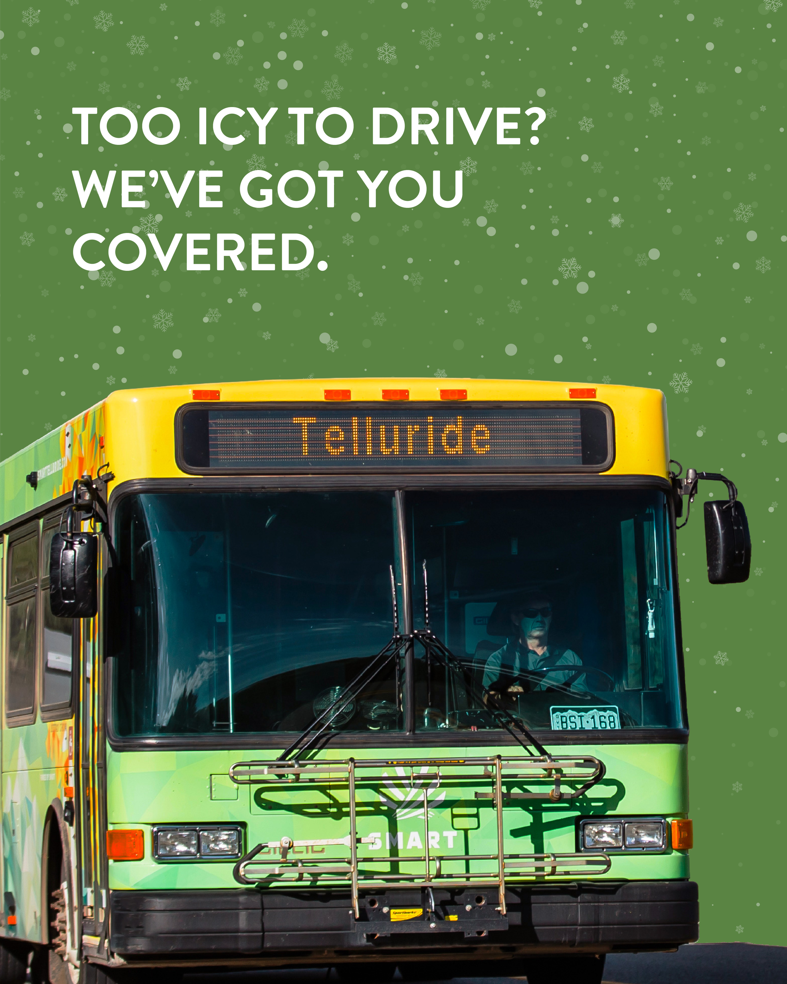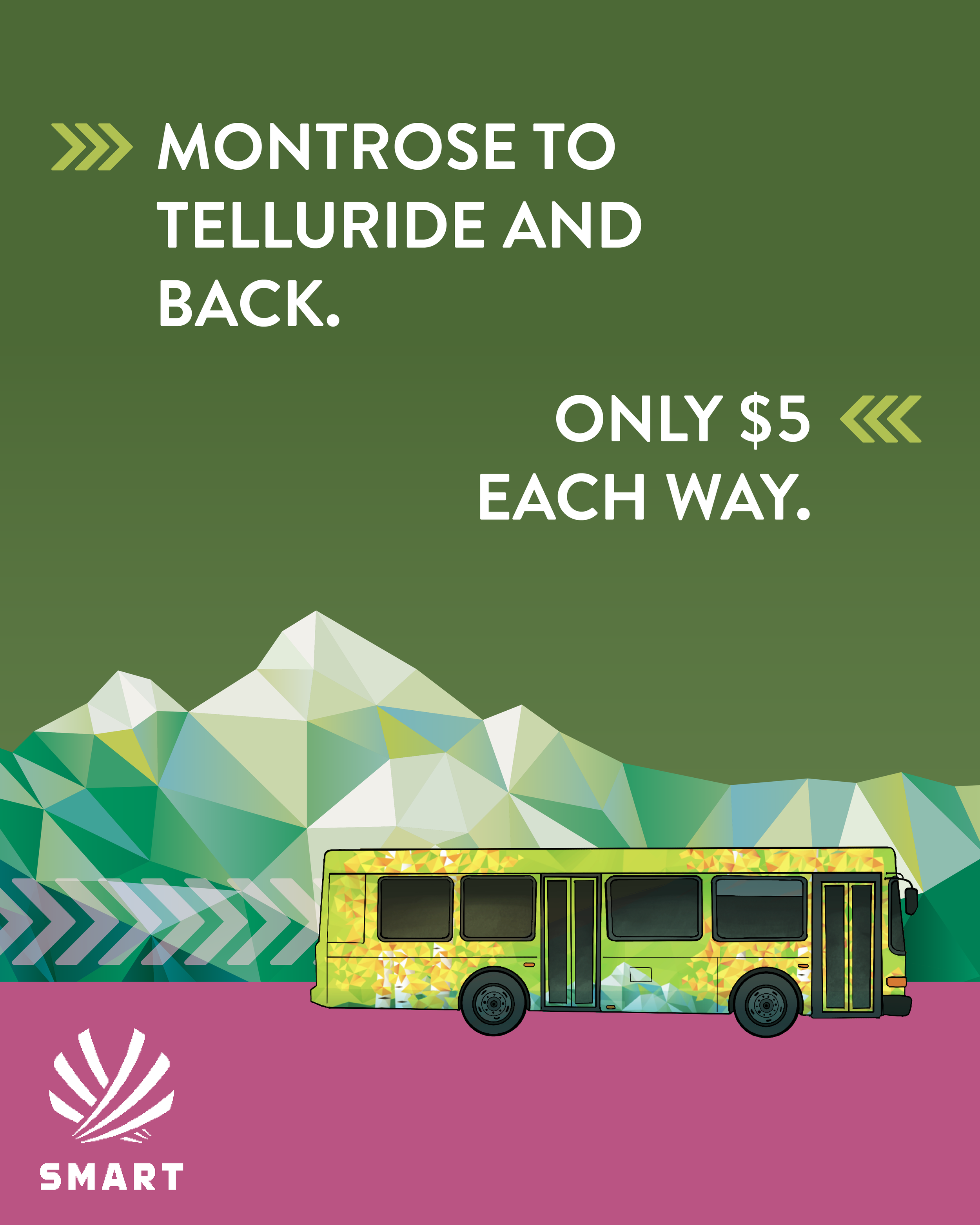 While working with Studio Six Branding, I was assigned to make social media posts for one of our regular clients, SMART (San Miguel Authority for Regional Transportation), a regional bus system in San Miguel County, CO, that mostly serves workers commuting into the county seat and ski destination of Telluride. SMART’s branding emphasized safety and economic values to reflect their ridership, which I often imbued with a playful feel to give the posts life and encourage engagement.