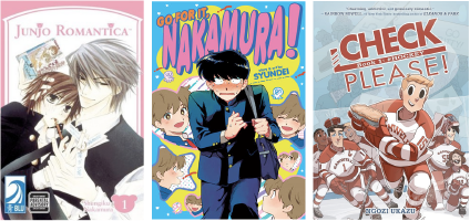 Fig. 1: Three popular Yaoi and Boys’ Love works: Junjou Romantica (Shungiku Nakamura, 2002), Go For It, Nakamura! (Syundei, 2014), and Check, Please! (Ngozi Ukazu, 2017)